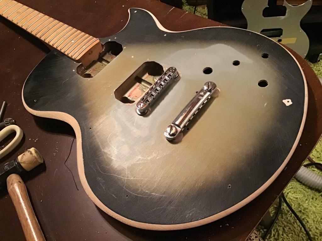 最初の写真は、ブリッジとテイルピースの位置修正、